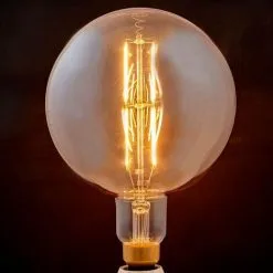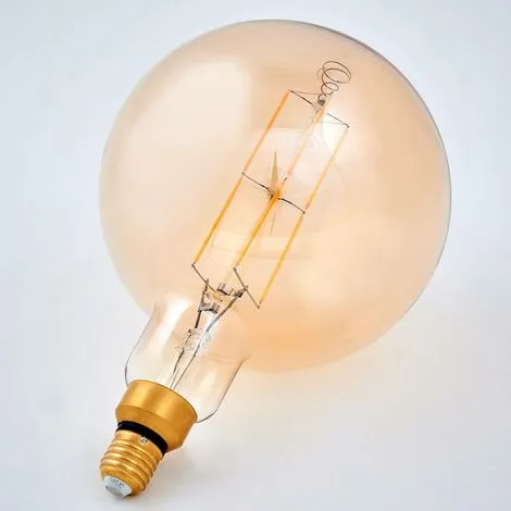 La grande forme du globe et les LED intégrées selon la technique du filament à l’intérieur du verre ambré font de cette lampe de verre à LED avec culot E27 un accroche-regard dans les grands luminaires ouverts ou les luminaires en cage ou dans les douilles des suspensions très tendance sans abat-jour du tout.